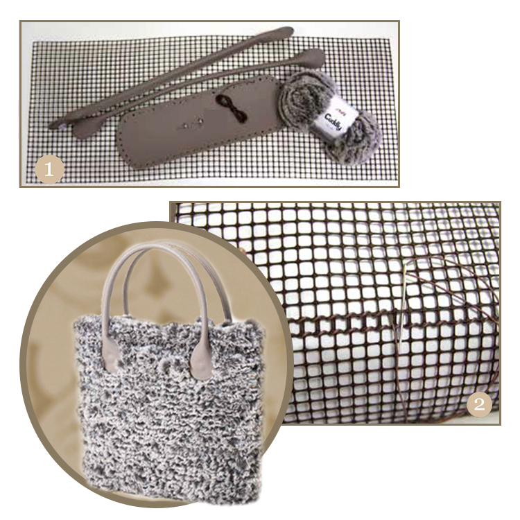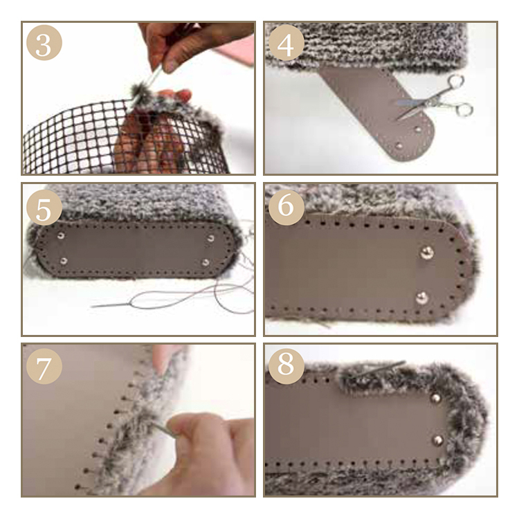 Découper dans le filet un rectangle de 70x30 carrés (photo 1), en vérifiant que la longueur du filet correspond à la circonférence du fond. Egaliser les bords. Pour refermer le filet, faire chevaucher une rangée de carrés et fixer avec le cordon en coton ciré (photo 2). A la fin, la circonférence doit être de 69 carrés.Faire un noeud coulant avec la laine “Cuddly), en faisant passer de l'intérieur du sac vers l'extérieur, pour cela, utiliser un crocher de 6mm et faire une chainette en passant pas chaque carré (photo 3). Tisser le sac en travaillant en rond et finir la bordure du haut en faisant un double point par carré. Attacher les pieds sur le fond en faisant des petites fentes avec la pointe de ciseaux (photo 4). Assembler le sac au fond en fixant par 4 points avec le cordon en coton ciré (photo 5). Coudre toute la bordure (photo 6) . Finir le dernier tour avec un points de chainette (photo 7). Pour masquer les coutures, faire une chainette en passant par chaque trou avec un crochet de 3.5mm (photo 8). Il est recommandé de ne pas garder la laine sous tension. Visser les anses à votre discrétion.
