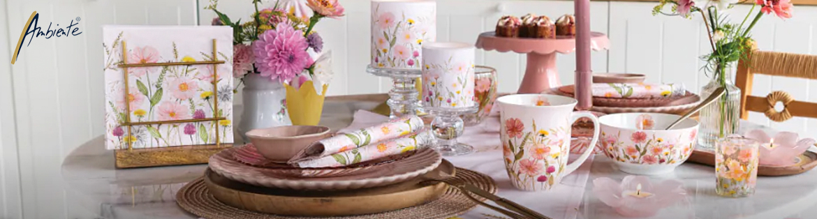 Ambiente est une marque allemande bien connue, appréciée depuis de nombreuses années pour ses serviettes en papier décoratives de haute qualité. Pour la nouvelle saison, Ambiente présente une large collection de serviettes de printemps avec des motifs frais, floraux et fruités — des fleurs luxuriantes et des abeilles bourdonnantes aux branches d’olivier, citrons et fraises.