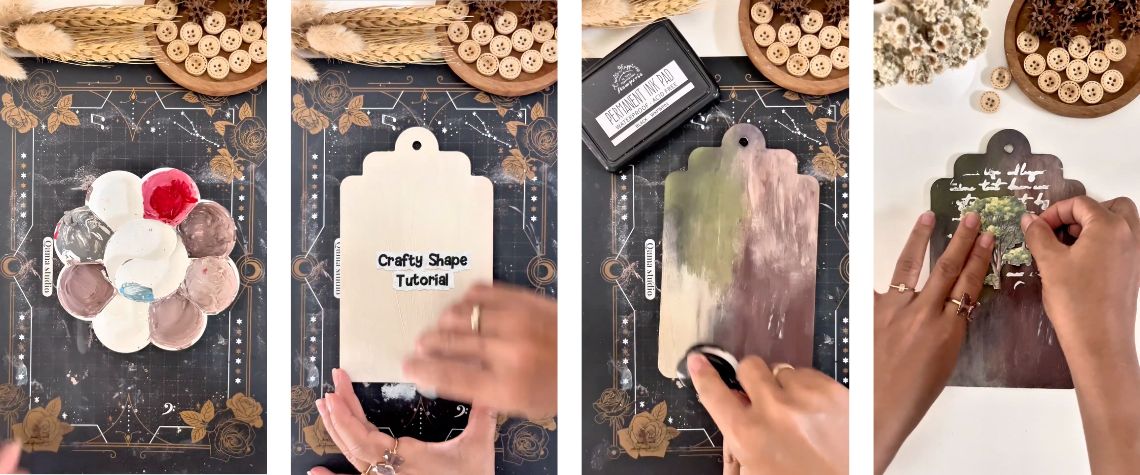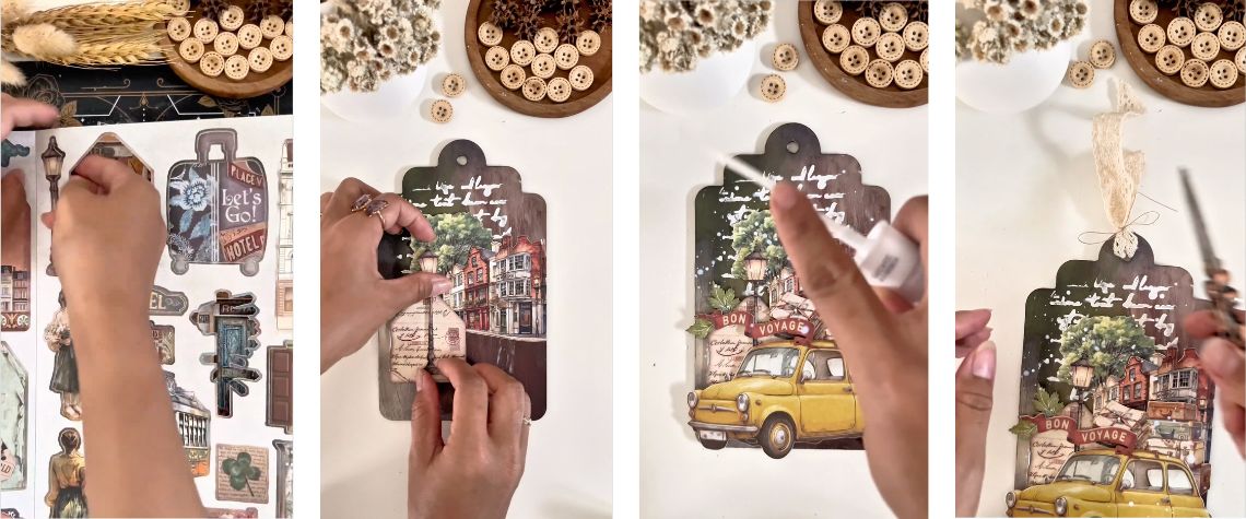 Dans la vidéo, on voit comment une base simple se transforme peu à peu en une décoration à suspendre riche en détails. En travaillant couche après couche avec des éléments découpés, des papiers décoratifs et des accents, le projet gagne en profondeur et en charme visuel, avec un vrai côté narratif.
