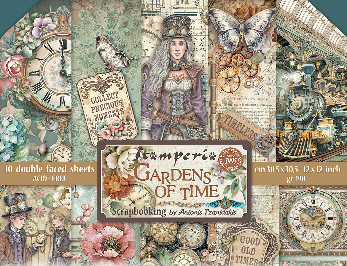 C’est précisément cette combinaison qui rend Gardens of Time intéressante pour un large public créatif. La collection offre suffisamment de cohérence pour développer un thème complet, tout en apportant assez de diversité pour les cartes, les journaux, les pages de scrapbooking et les applications décoratives en mixed media.