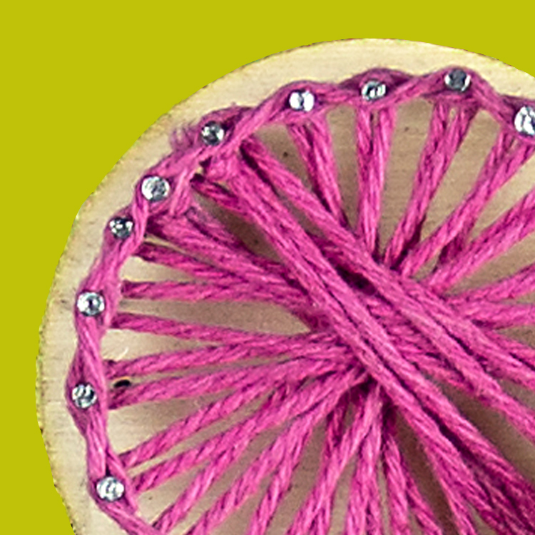 • Faire un noeud coulant autour d'une pointe et tisser couleur par couleur dans un peu tous les sens. (Fixer éventuellement avec une pointe de colle)