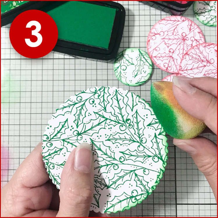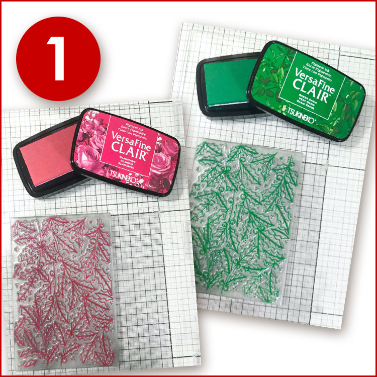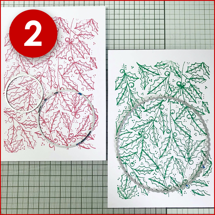 Encrer le tampon houx avec des encres rouge et verte et tamponner sur sur du papier blanc.