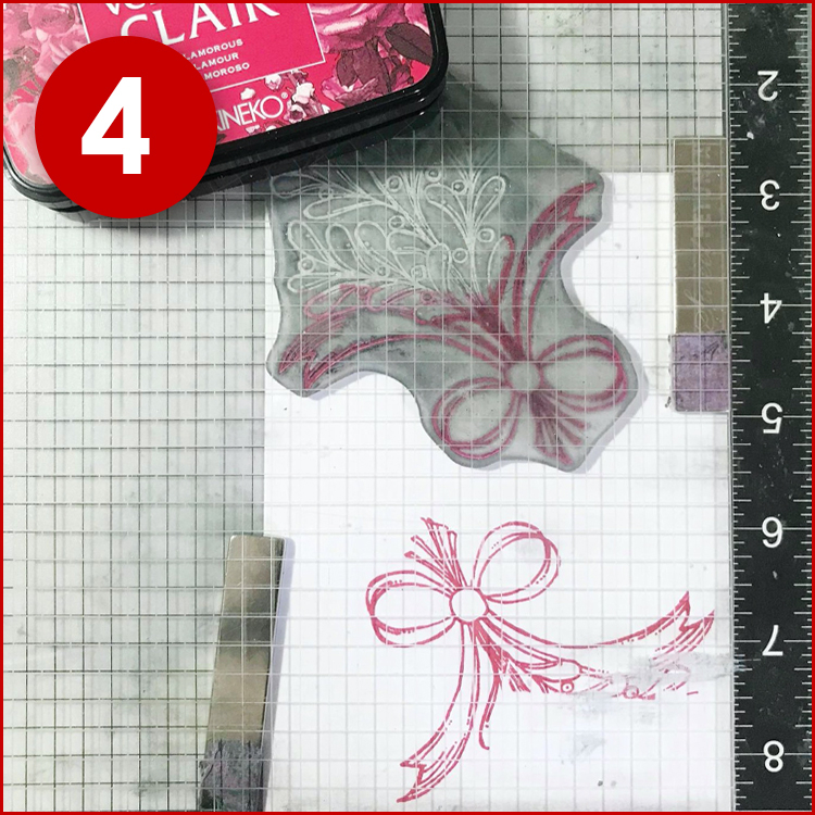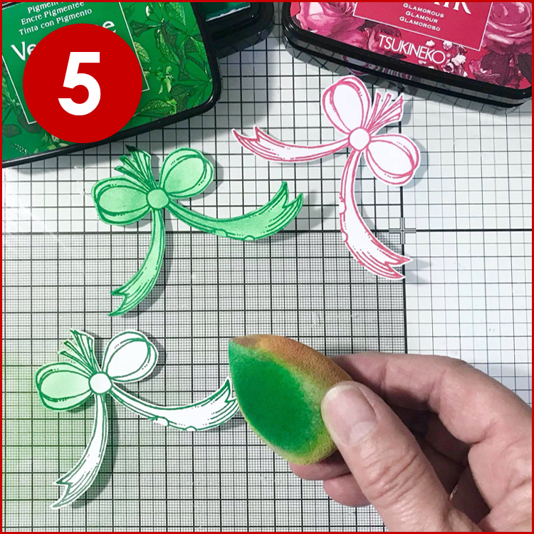 Etape 4: Tamponner sur du papier blanc uniquement le noeud à partir du set 'Under the Mistletoe'. Tamponnez en deux en vert et un en rouge pour les marier aux boules. Découper avec des ciseaux.