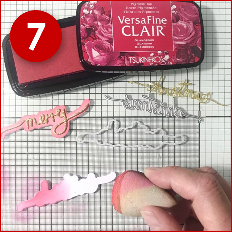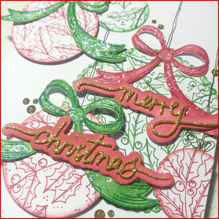 Découper dans du papier blanc les mots " Merry" et "Christmas" ainsi que les ombres avec le gabarit 'Christmas Profile Die Set '. Décpuper ensuite uniquement "Merry" et "Christmas" dans de la mousse dorée. Utiliser de l'encre rouge et une éponge pour colorer les ombres. Coller les mots dorés sur les ombres. Utiliser ensuite des carrés de mousse pour les fixer sur la carte. 'Merry' sur la grosse boule verte et 'Christmas' juste sous le noeud de la boule rouge. Ajouter encore quelques pois dorés avec les Glossies Sugar Berries. Appliquer de la colle pailletée sur les noeuds et laisser sécher.
