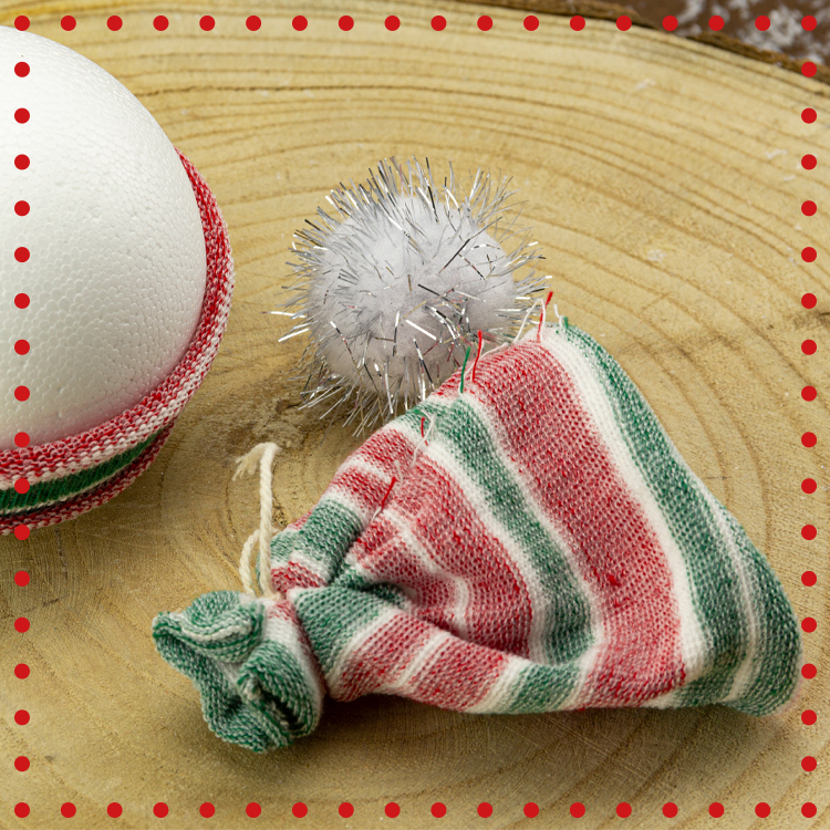 2) Mettre le morceau de manchon à l'envers et fermer un des bouts avec une ficelle. Remettre à l'endroit puis fixer un pompoms sur le bonnet avec un pistolet à colle.