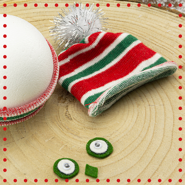 Pour le bec: Découper un petit losange dans de la feutrine verte. Coller le tout sur la boule en poystyrène avec un pistolet à colle.