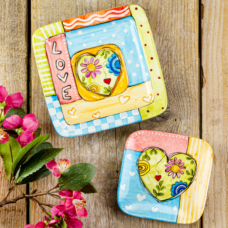 Dégraissez la porcelaine avec l'acool Ketonatus. Utilisez les couleurs de votre choix. Dessinez d'abord très finement un coeur et partagez en même temps la surface en plusieurs cases, laissez vous aussi guider par la forme du support. Appliquez une fine couche de peinture dans chaque case. Ici, les couleurs sont pastelles grâce à l'ajout de blanc et/ou de médium fluide. Vous pouvez aussi choisir de mettre une autre couleur par-dessus ou de rendre les couleurs plus vives. Vous pouvez retirer de la couleur ici ou là avec un coton-tige trempé dans de l'alcool, comme ici pour les petits coeurs et les fleurs. Utilisez votre imagination et donnez libre cours à votre plaisir de créér. Lorsque vous êtes satisfait(e) du résultat et que tout est sec, ajoutez les contours avec un feutre noir. Les contours du coeur sont irréguliers pour un résultat plus ludique. Laissez sécher au moins 24 h et plus si possible puis faire cuire au four pendant 35 minutes à 150 degrés. Evitez ensuite le lave-vaisselle et le micro-ondes!