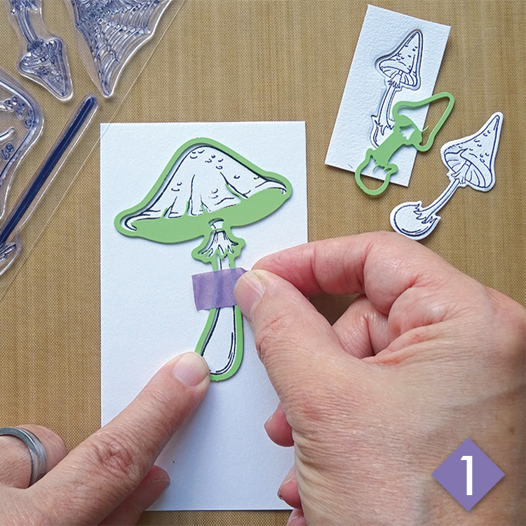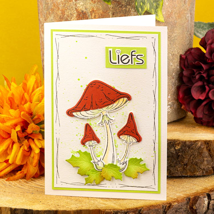 Découpez quelques feuilles de papier vert. Donnez-lui de la couleur avec de l'encre si nécessaire. Découpez un rectangle de 9,6x14,3cm dans le même papier vert. Collez-le sur une carte rectangulaire de 10,5x14,8cm. Fixez les champignons et les feuilles (avec le kit 3d) sur la carte.