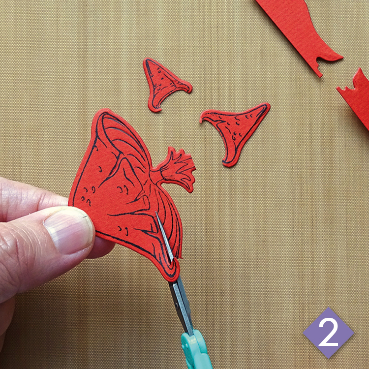 Tamponnez les champignons à l'encre noire sur du papier (aquarelle). Tamponnez les chapeaux des champignons sur du papier rouge.