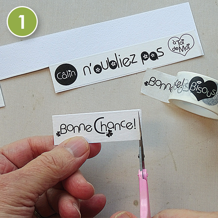 • Coller le washi tape sur du papier blanc et découper le texte désiré.