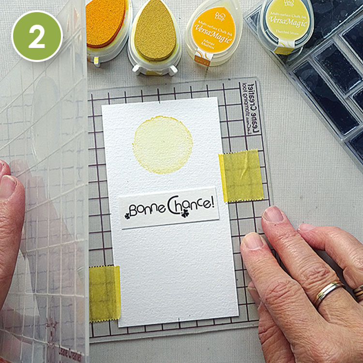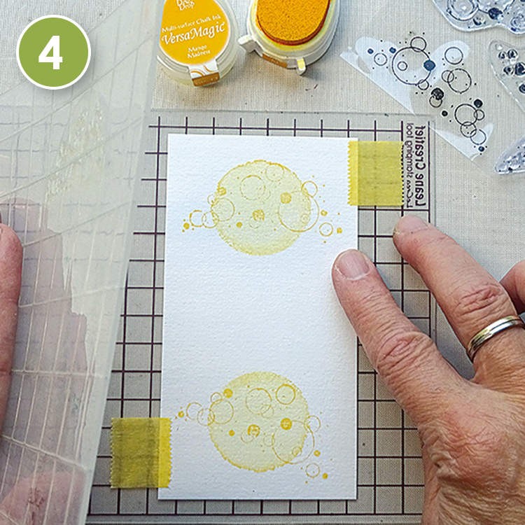 • Tamponner sur les cercles la texture désirée avec de l'encre jaune foncé.