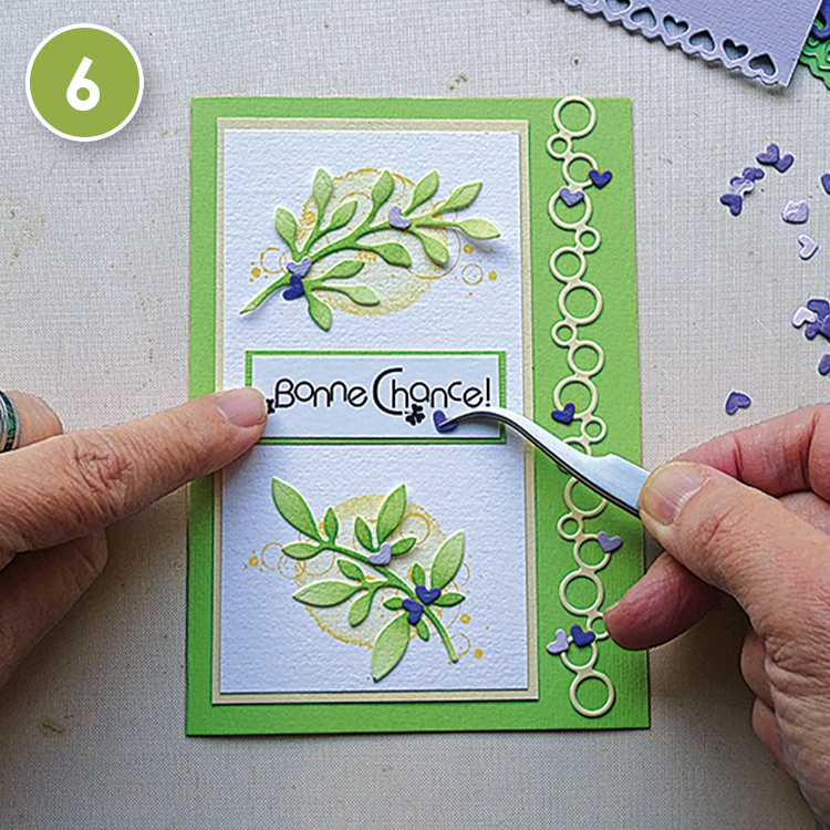 • Découper des coeurs dans du papier lilas et les coller sur la carte pour décorer.