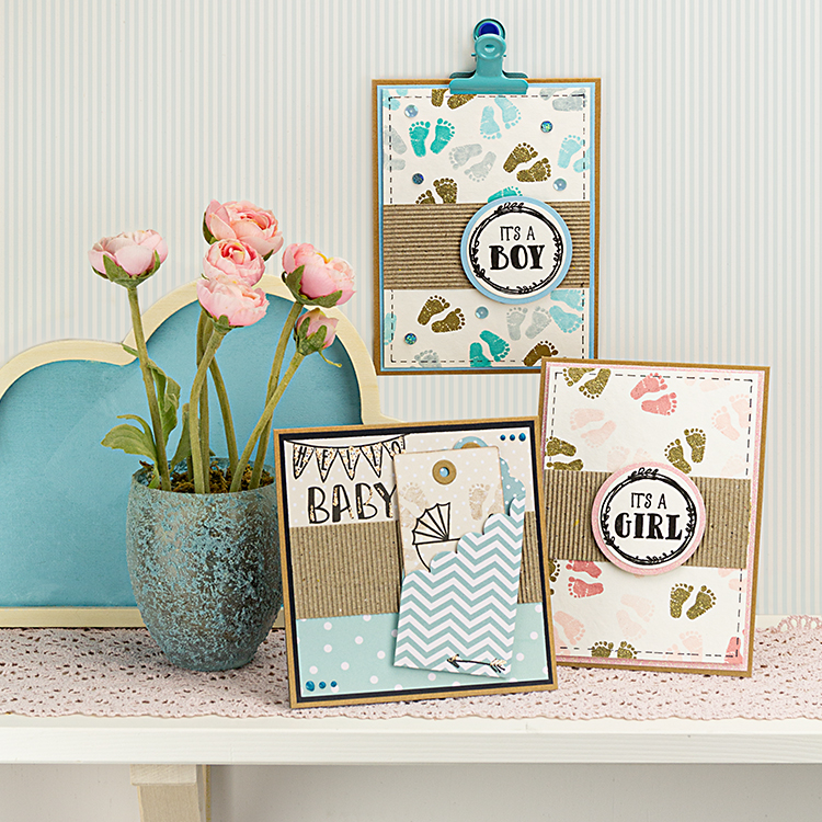 Coller dessus un rond en papier pailleté et un autre rond un peu plus petit avec un texte tamponné (Hello baby).