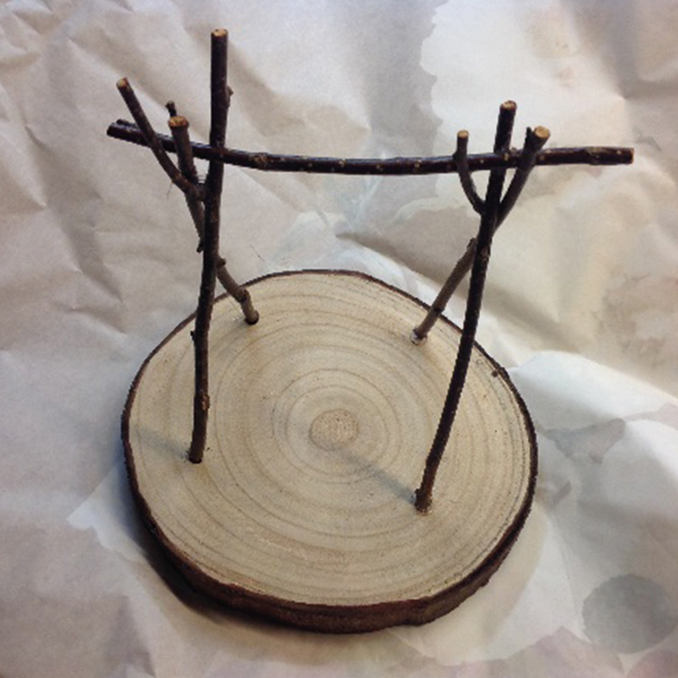Le cadre de la balançoire: Chercher des branchages, mesurer leur circonférence et percer des trous dans le disque en bois. Les coller avec un pistolet à colle et les fixer en haut avec de la ficelle.