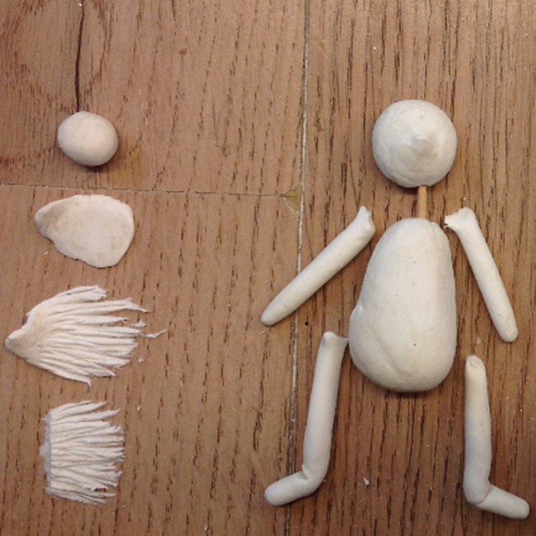 Faire un rouleau et le découper au milieu pour les bras et un rouleau un peu plus gros pour les jambes. recourber une extrémité pour créer les pieds.