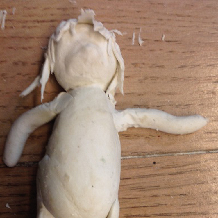 Les cheveux: faire une petite boule de pâte et l’aplatir sur et autour de la tête. Utiliser un peu d’eau pour les coller.