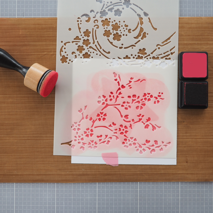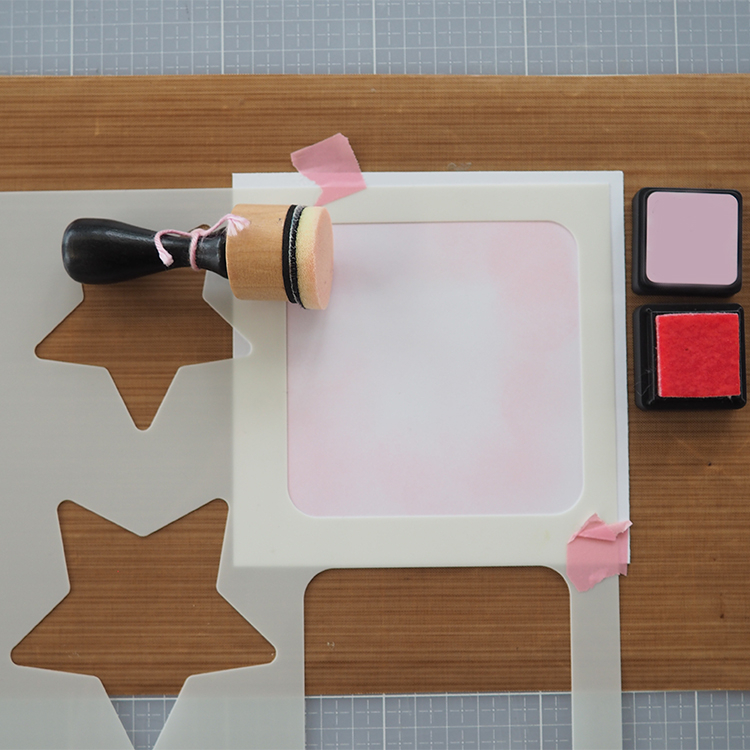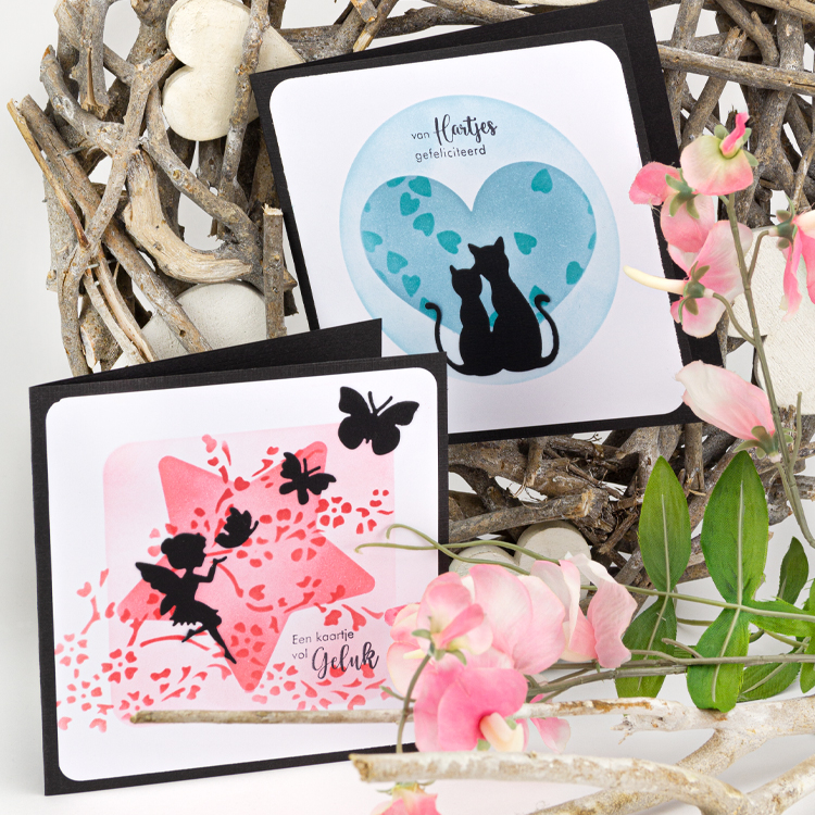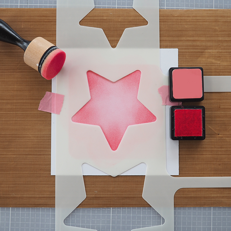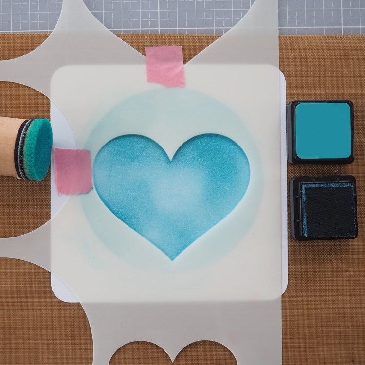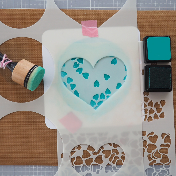 Utiliser enfin un pochoir Mask pour apporter des détails, structure ou coeurs. Définir l'emplacement des silhouettes sur la carte et choisir un texte.