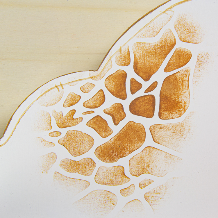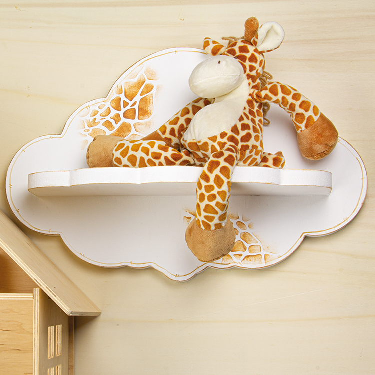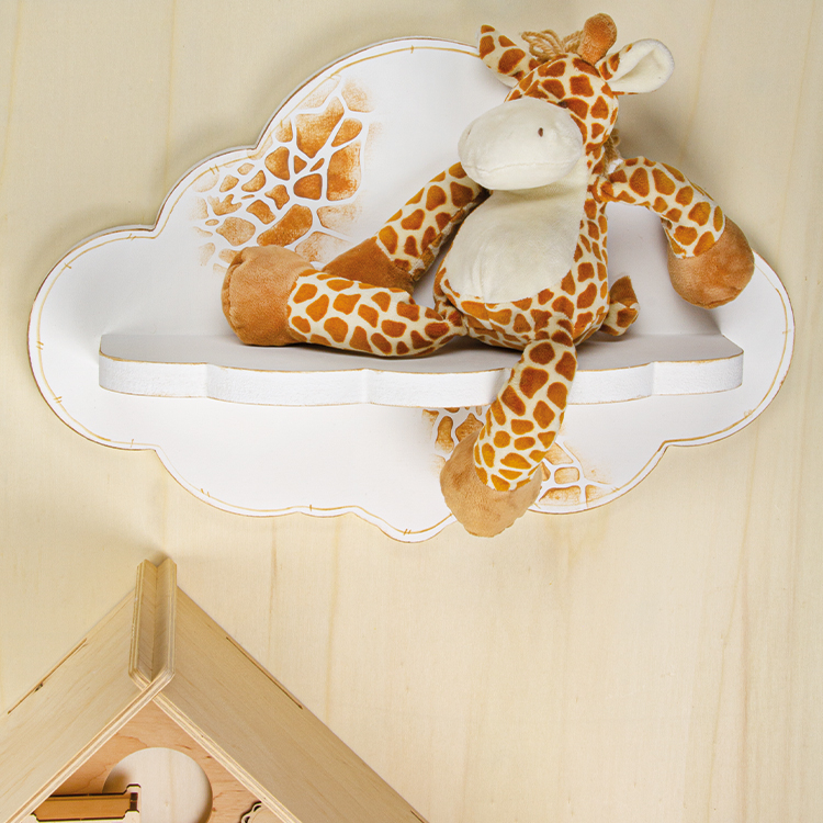 Coller les élément de l'étagère ensemble et peindre de plusieurs couches pour un résultat uniforme. Mélanger la peinture des couleurs de la girafeMeng de verf in de kleuren van de giraffe. Positionner le pochoir et utiliser de l'adhésif pour le maintenir en place. Pendre un tout petit peu de peinture avec un pinceau pochoir et faire des mouvements circulaires en commençant là où il y a le plus de peinture pour que l'extérieur soit plus clair. Il faut donc toujours commencer par le centre. Appliquer avec une éponge et un epeu de Prov. Beige dilué sur les bordures. Peintre ensuite avec un pinceau Liner une bordure très fine de la couleur de la girafe à environ un demi centimètre du bord. Une étagère adorable dans une chambre de bébé!
