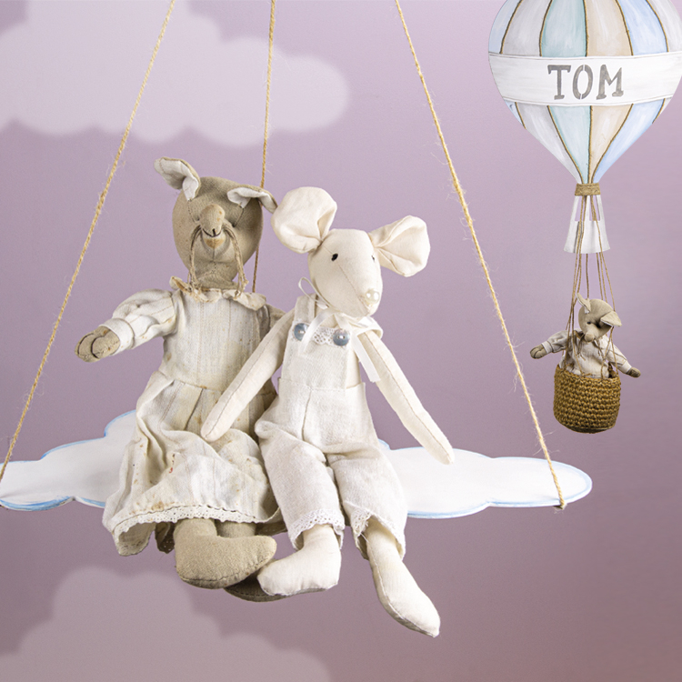 • Sur le nuage il y a aussi 2 peluches. Le nuage est décoré d'une bordure bleue.