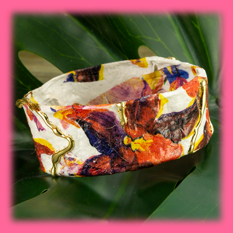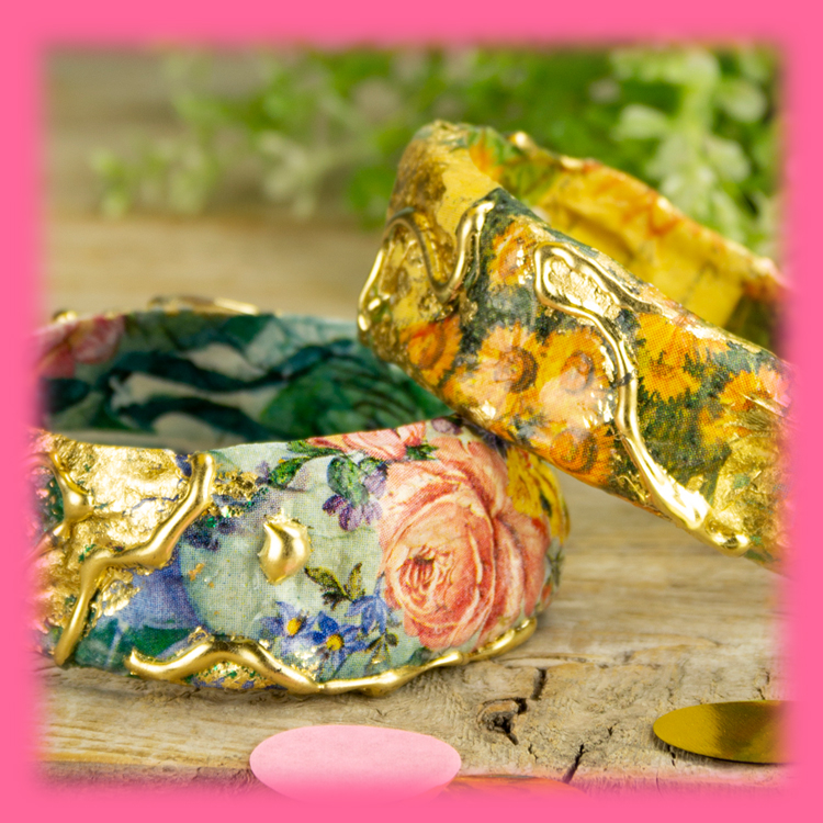 Poncer les bords avec du papier de verre. Peindre le bracelet en blanc. Laisser sècher puis coller une serviette du motif désiré. Laisser sècher puis décorer le bracelet avec un pistolet à colle, faire, par exemple, des traits, des spirales, des boules... Lorsque la colle a refroidi, la feuille d'or peut être appliquée directement. Bien frotter et retirer le surplus avec un pinceau. Pour terminer, le bracelet peut être verni. Si le bracelet est difficile à enfiler, il peut être coupé mais cela le fragilise.