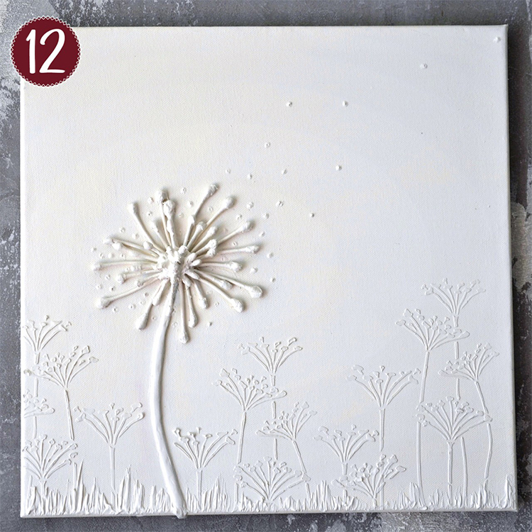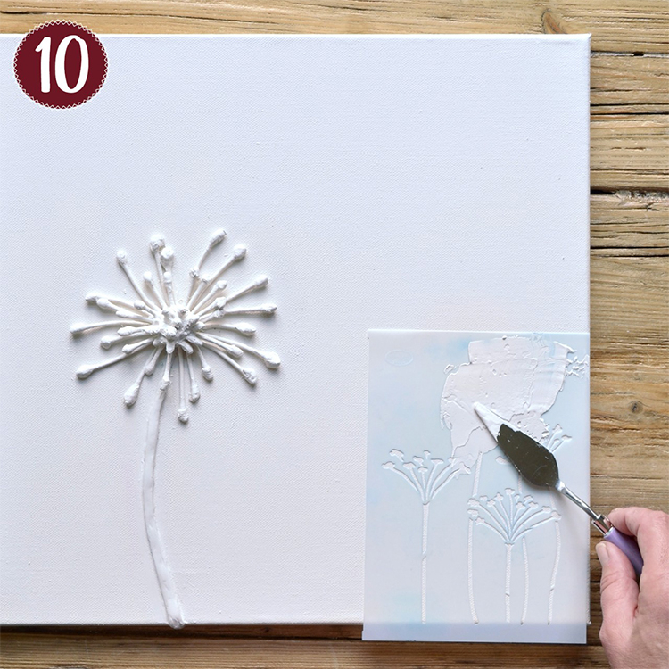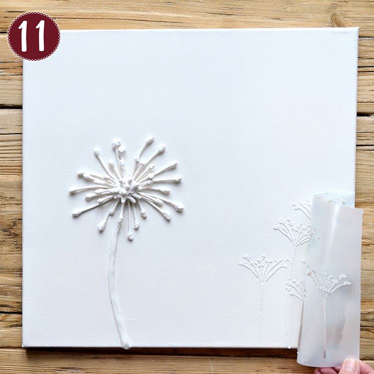 11 - Retirer le pochoir directement. Répéter l'opération plusieurs fois jusqu'à obtenir un champ de pissenlits sur la toile