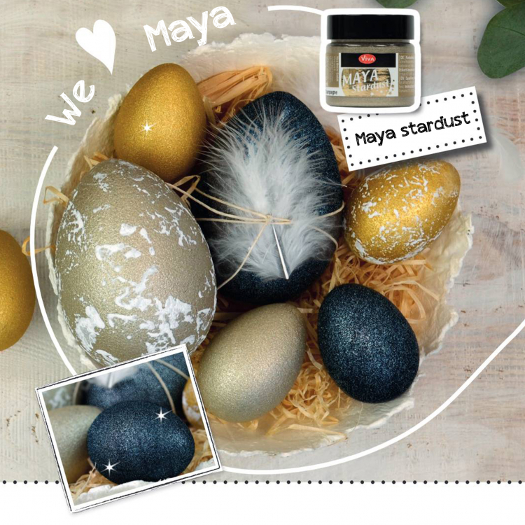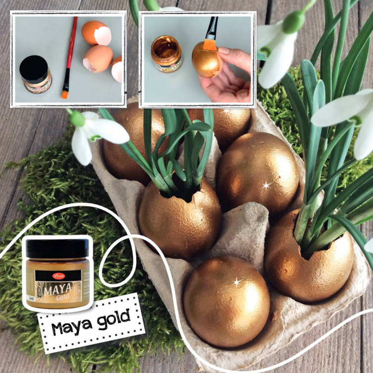 Peindre les oeufs avec Maya Gold or comme ici ou choisissez une autre couleur, mettez des fleurs, tiges à l'intérieur.