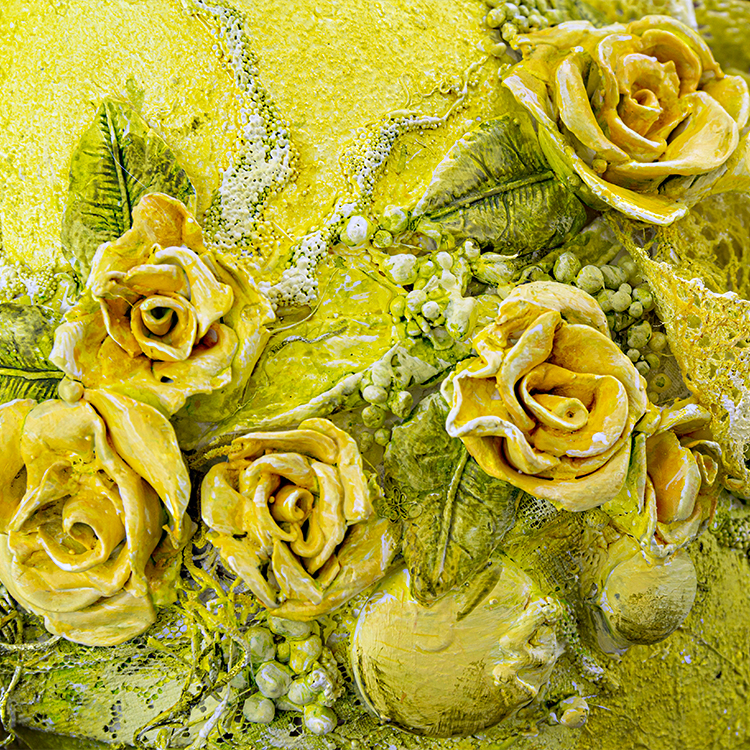 Peindre le tout en blanc et laisser sécher. Peindre ensuite avec du jaune dilué et une touche de vert olive. la partie supérieure et les roses sont plus jaunes et la partie inférieure et les feuilles plus vertes.
