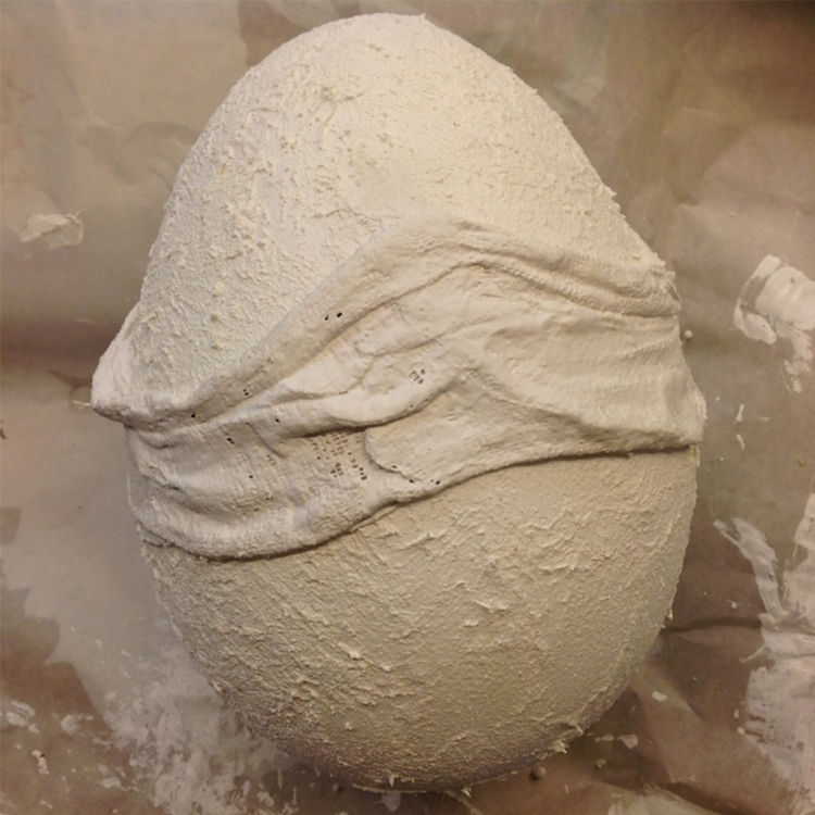 L'oeuf en polystyrène est composé de 2 parties. Les coller ensemble puis appliquer de la pâte structure tout autour pour masquer les reliefs et la jointure.