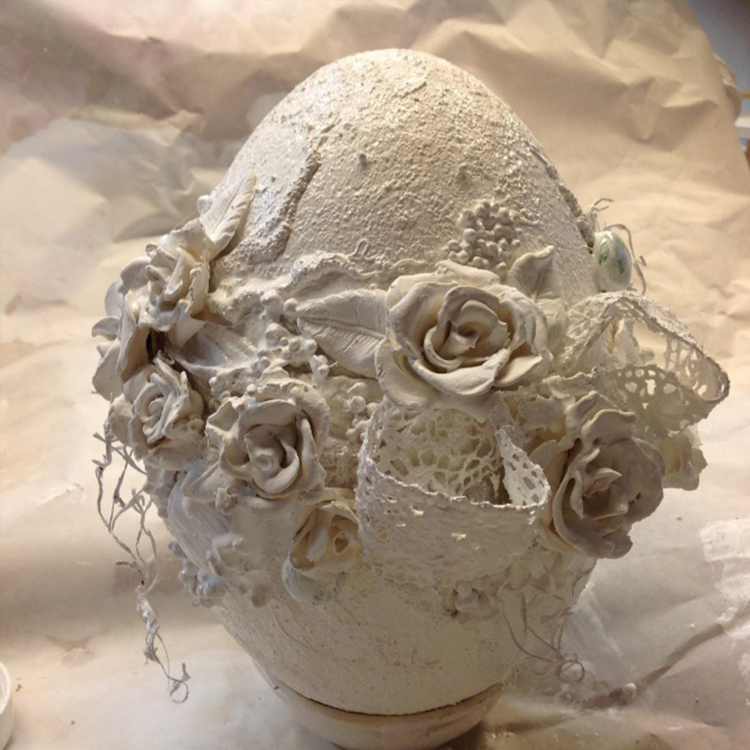 Les décorations: Enrouler une bande de plâtre autour de l'oeuf ou de la ficelle de jute, de la dentelle, ou des chutes de rubans/tissus.