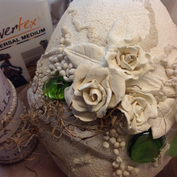 Ajouter ensuire des roses et des feuilles (faites les à la main ou utilisez un moule en silicone), de la mousse, des boules Powetex (medium ou small), du sable...