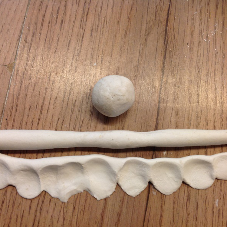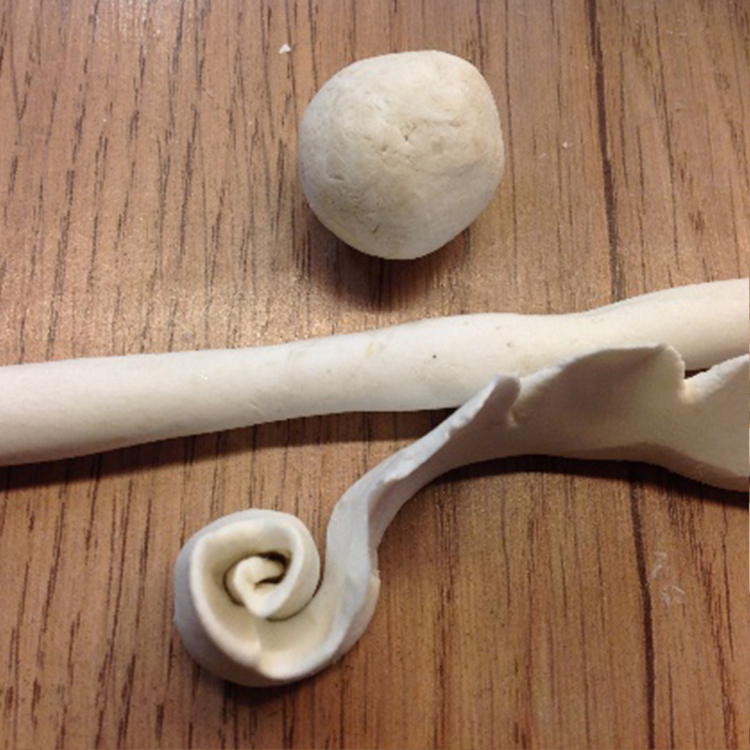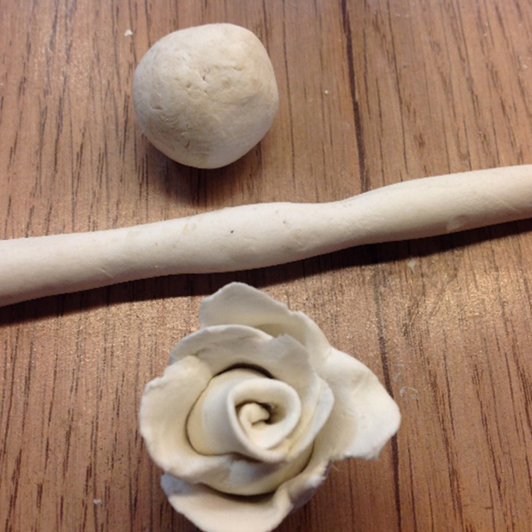 1. Faire une boule (± 3cm). En faire un rouleau (± 15cm). Former des pétales de rose avec les doigts.