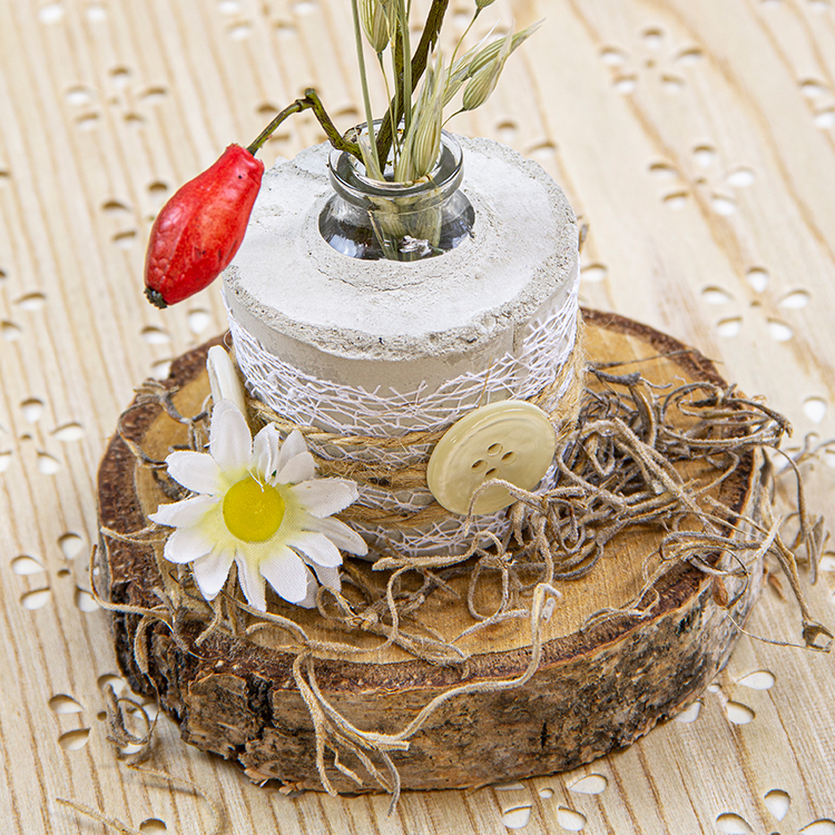Si vous voulez un résultat industriel, vous pouvez garder le béton brut. Si vous voulez un résultat plus romantique, ajoutez de la dentelle, des boutons ou breloques.