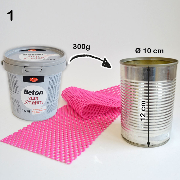 1: Pour une boîte de ø10 cm et une hauteur de 12 cm il faut 300 gr. 'Beton zum Kneten'.